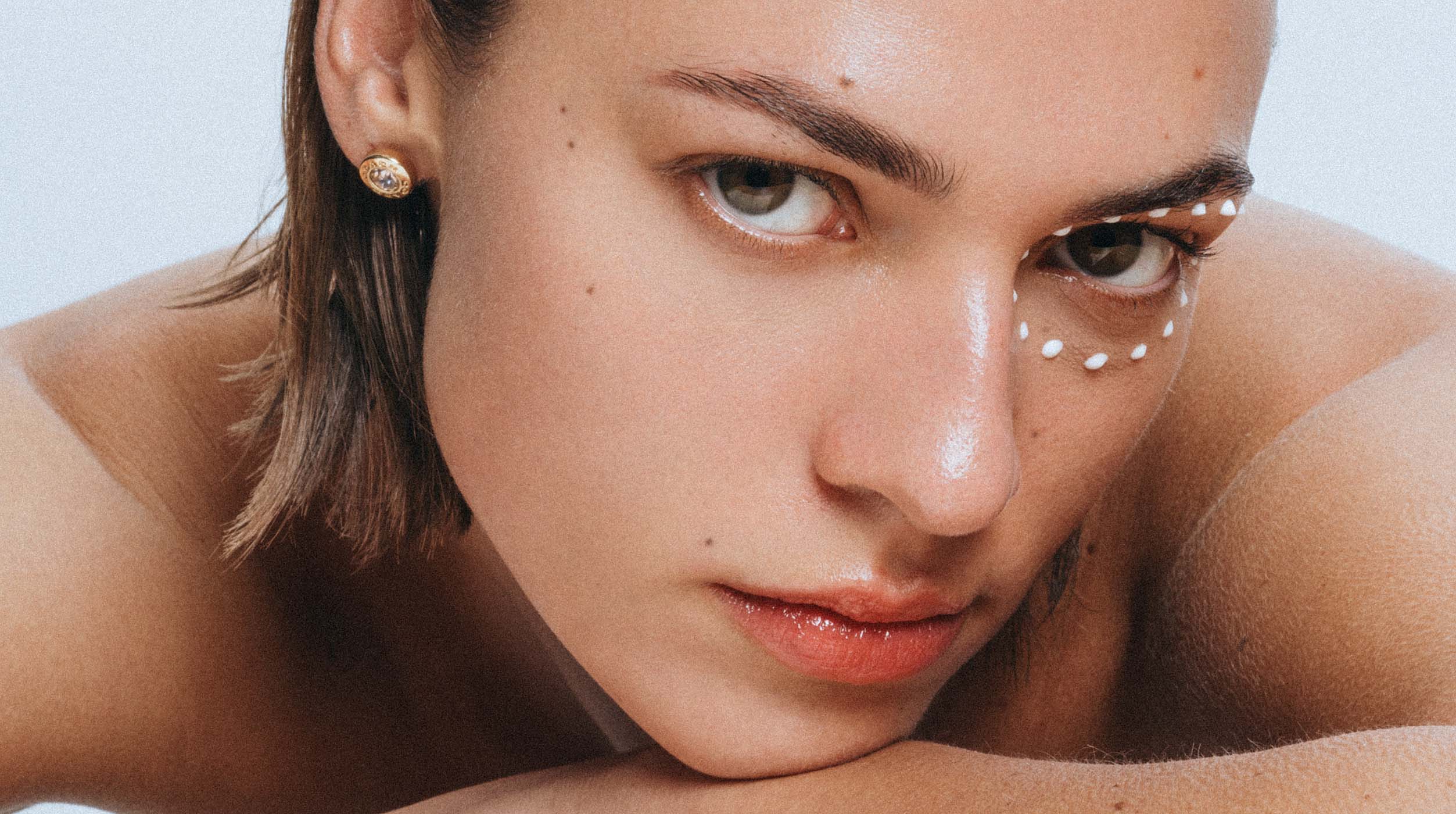 Ein weiteres Highlight war das Motiv mit den Coach-Ohrringen. Hier kamen die Facelift-Stripes von Kryolan zum Einsatz – ein kleines, aber wirkungsvolles Detail, das uns einiges an Geduld und mehrere helfende Hände abverlangte. Nicole hatte mir zuvor einige Referenzbilder gezeigt, worin dies ebenfalls zum Thema Skincare verwendet wurde, und ich war sofort begeistert von der Idee. Selbst wenn dieses Bild nicht für die Veröffentlichung ausgewählt worden wäre, hätte ich es trotzdem bearbeitet – einfach, weil die Ästhetik so überzeugend war.
